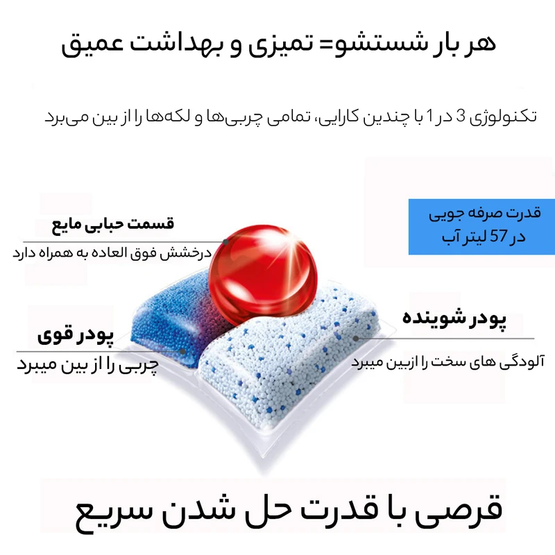 قرص ماشین ظرفشویی فینیش با قابلیت تمیزکنندگی فوق العاده قوی، براق کنندگی، چربی و لکه زدایی و همچنین جلوگیری از ایجاد رسوب و آهک در ماشین ظرفشویی یکی از بهترین انتخاب ها برای شستشوی ظروف است. این محصول بدون رایحه عرضه است و عطر خوش پاکیزگی در ظروف و دستگاه به جا می گذارد. این محصول جدیدترین سری قرص ماشین ظرفشویی برند finish بوده که به دلیل داشتن فرمول جدید حتی سخت ترین لکه های سوخته و خشک شده غذا را از بین می برد. نحوه استفاده از قرص ماشین ظرفشویی بسیار آسان است. کافیست ابتدا باقیماندهی ذرات غذایی ظروف را پاک کنید و طبق دستورالعمل سازنده ی ماشین ظرفشویی، قرص را درون ماشین قرار دهید. مشخصه ها این محصول با قدرت تمیز کنندگی بالا نیاز به خیساندن ظروف را از بین می برد و بنابراین به صرفه جویی در مصرف آب تا 57 لیتر کمک شایانی می کند. سبب براق و درخشان شدن بینظیر ظروف شیشه ای می شود و از ظروف شیشه ای محافظت کرده و مانع لب پر شدن ظرف ها می گردد. این محصول برای کسانی که غذا خوردن و غذا درست کردن را دوست دارند؛ کار سخت شستن ظروف را آسان تر می کند. دیگر بدون اینکه به مشکل شستن ظروف فکر کنید می توانید از خوردن غذا کنار کسانی که دوست دارید لذت ببرید. قابلیت چربی زدایی این محصول سلامت طولانی مدت دستگاه را تضمین می کند. در نتیجه با پیشگری از بروز خرابی در دستگاه، هزینه تعمیرات آن را کاهش می دهد. برای استفاده از آن نیازی به جدا کردن پوشش قرص نیست و قابلیت حل شدن در آب را دارد. فینیش کوانتوم با قیمت مناسب و موادی که درونش دارد پاک کنندگی قدرتمندی ارائه می دهد، نسبت به پاکسازی لکه های سرسخت نیز نتیجه ای موفقیت آمیز دارد و انتخابی اقتصادی خواهد.