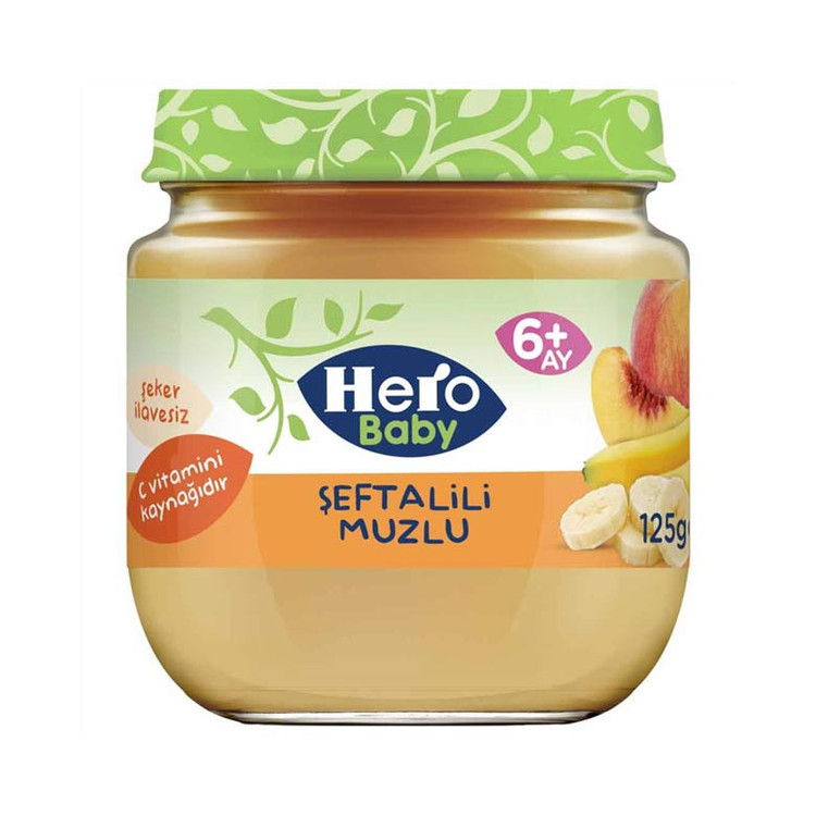 پوره میوه موز و هلو بدون شکر 125 گرمی هیرو بیبی Hero Baby ترکیبی سالم و بدون مواد افزودنی از میوه هایی بسیار مفید است که برای استفاده راحت نوزادان و کودکان به شکل پوره تولید شده است. این محصولِ سرشار از مواد مغذی، به ویژه برای نوزادانی است که تازه شروع کرده اند غذا بخورند. روند تولید نیز به نحوی است که هیچ گونه ماده افزودنی طعم دهنده ،نگهدارنده و شکر، حتی در مقادیر کم استفاده نمی شود. تاکید گروه صنعتی هیرو علاوه بر فرآوری سالم محصولات، مدت زیادی است که روند کشاورزی و باغداری مواد اولیه اش را نیز در اختیار گرفته است و نظارت کاملی بر آن دارد. تمامی میوه های استفاده شده در محصولات هیرو از استانداردهای بالا برخوردارند و کیفیت بی نظیر آن ها را میتوان در محصول نهایی مشاهده کرد. این محصول دلپذیر، می تواند برای تامین مواد مورد نیاز بدن کودکان و نوزادان بسیار مفید باشد . پوره آماده موز و هلو هرو بیبی، غذایی مغذی و خوشمزه برای نوزادان و شیرخواران بالای 6 ماه است.